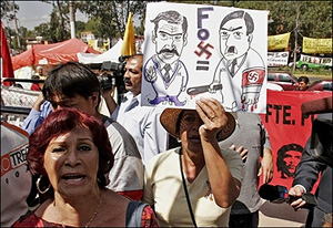 | | A supporter of Mexican defeated presidential candidate Andres Manuel Lopez Obrador, holds a poster representing Mexican President Vicente Fox and German dictator Adolf Hitler. Hundreds of leftist legislators supporting Andres Manuel Lopez Obrador took over the podium in Mexico's Congress forcing President Vicente Fox to cancel the annual state of the nation address. (AFP/Alfredo Estrella) | After left-wing lawmakers protesting at alleged election fraud forced outgoing Mexican President Vicente Fox to abandon a key speech, the BBC's Duncan Kennedy asks just how far the protests could go.