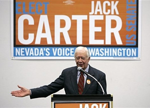 | | Former President Jimmy Carter introduces his son, Jack Carter, the Democratic nominee for the U.S. Senate, at a campaign rally in Henderson, Nev. on Friday, Sept. 29, 2006. (AP/Laura Rauch) | Former president urges Nevada voters to combat administration.