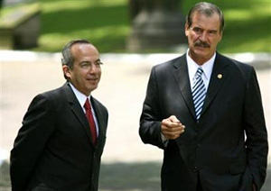 | | Mexico's President Vicente Fox (R) talks with Felipe Calderon, Mexico's president-elect, at the presidential residence Los Pinos in Mexico City September 6, 2006. [Reuters] | Uncharismatic, wonkish and often short-tempered, Mexican President-elect Felipe Calderon has perhaps the weakest mandate in this country's modern history.