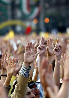 | | Supporters of Andres Manuel Lopez Obrador of the Party of Democratic Revolution (PRD) raise their arms during the national democratic convention in Zocalo main square in Mexico City September 16, 2006. Aides said Obrador, who narrowly lost the presidential election, would use mainly political means rather than widespread protests in leading opposition to conservative President-elect Felipe Calderon. (Reuters/Henry Romero) | Mexico awoke yesterday with a new political dilemma: The country now has two presidents-elect, one of them chosen at the ballot box and the other self-anointed.