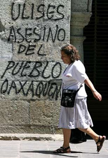 | A woman walks past a wall containing writings that read: 'Ulises killer of Oaxacas people' at Oaxaca's main square September 28, 2006. Members of of the Popular Assembly of Oaxaca (APPO) were demanding the state governor Ulises Ruiz's resignation. (Reuters/Daniel Aguilar) | Darryla and Dan McCrath enjoyed life in Oaxaca, Mexico, until political violence caused them to relocate to a nearby pueblo.