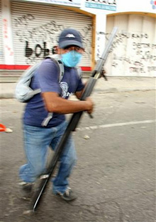 | | A member of the Popular Assembly of Oaxaca (APPO) holding a homemade rocket runs during a shooting at a protest in Oaxaca City. (Daniel Aguilar/Reuters) | Around three o’clock in the morning of Aug. 22, my husband and I awoke to the sound of alert rockets popping in the night air. Our children slept blissfully unaware; here in Mexico, numerous fiestas are punctuated with fireworks. But this was different. These warning signals were being released by members of a teachers’ union, which since mid-May has paralyzed the state of Oaxaca in a strike, joined by a broad-based citizens’ coalition after government repression June 14 (NCR, Oct. 13).