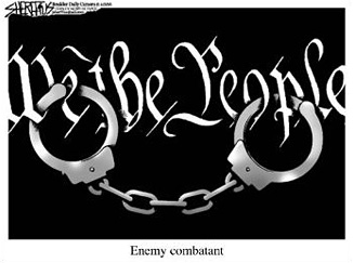 Put it all together, and last week's passage of the Military Commissions Act is ominous for those in the US. As Bruce Ackerman noted recently in The Los Angeles Times, the legislation "authorizes the president to seize American citizens as enemy combatants, even if they have never left the United States. And once thrown into military prison, they cannot expect a trial by their peers or any protections of the Bill of Rights." The vague criteria for being labeled an enemy combatant (taking part in "hostilities against the United States") don't help either. Would that include anti-war protestors? People who criticize Bush? Unclear.