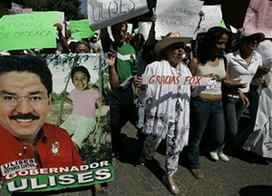 | | Thousands of residents fed up with violence march in support of Oaxaca state Gov. Ulises Ruiz in the streets of Oaxaca City Tuesday, Oct. 31, 2006, in Mexico. (AP/Eduardo Verdugo) | Youths roamed the cobblestone streets of Oaxaca tossing gasoline bombs, hijacking vehicles and vowing to keep fighting for the state governor's ouster. Mexico's Congress urged the governor to resign and leftist leaders urged national support for the movement.