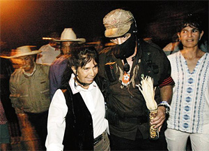 | | Holding an ear of maize - his metaphor for the ties between indigenous Indian tribes - Subcomandante Marcos walks with Maria Sandoval to a town hall meeting. (David Sanders/Arizona Daily Star) | Magdalena De Kino, Sonora — Twelve years after the Zapatista revolution erupted in the southernmost tip of Mexico, its celebrity spokesman brought his message of solidarity for the country's indigenous people north to Sonora.