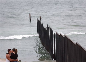 | | Raul Gomez, 35, and Lourdes Rolan, 36, kiss at a park overlooking the border wall while taking a break from work in Tijuana, Mexico. This section of the border wall separating Tijuana and San Diego, California, runs into the Pacific Ocean. Gomez, who is originally from the Mexican state of Guerrero, has lived in Tijuana for 12 years, but previously had worked in agricultural fields up and down the west coast of the United States. As the U.S. prepares to build a high-tech barrier with 700 miles (1,125 kilometers) of extra fencing, motion detectors and remote controlled devices, smugglers are already figuring out how to beat the new security. (AP/David Maung) | Rising from the Pacific surf and zig-zagging along the border for 14 miles, Tijuana's border fence has done little but push illegal migrants into the Arizona desert and feed the smuggling industry since it went up in 1994.
