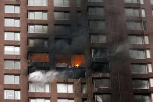 Firefighters shot water streams of water at the flames from the floors below and put the blaze out in less than an hour.