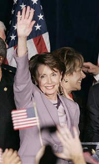 | | Democratic House leader Nancy Pelosi (D-CA) during a celebration at a hotel in Washington, November 7, 2006. (Larry Downing/Reuters) | Despite widespread problems with electronic voting machines, long lines that stretched several city blocks in some states, hours-long waiting at the polls, and GOP intimidation tactics aimed to drive away predominantly Democratic and minority voters, the public turned out en masse Tuesday and helped shift the balance of power in Washington, DC, to Democrats for the first time in 12 years.