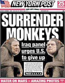 The conservative New York Post tabloid doctored a front-page photo to depict the co-chairmen of the Iraq Study Group in primate fur, under the headline "Surrender Monkeys," inspired by a frequently quoted line from "The Simpsons."