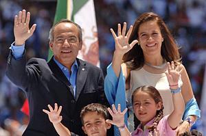 | | Felipe Calderon is joined by his wife, Margarita Zavala, and two of their three children, Luis Felipe, 7, (lower left) and Maria, 9 (lower right). (Luis Jimenez/Union-Tribune) | The thirty percent increase over three years in the price of the tortilla, the country's basic food, and the increase in American imports have provoked demonstrations.