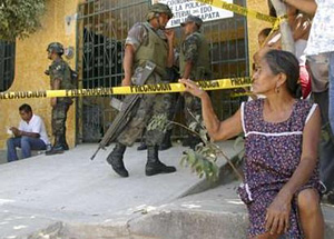| | A woman pulls back police tape as soldiers patrol outside a police station in the resort city of Acapulco February 6, 2007. Gunmen disguised as soldiers killed seven people at two police stations in the troubled Mexican resort of Acapulco on Tuesday, despite a military crackdown against violent drug gangs. (Reuters/J Guadalupe Perez) | Powerful drug gangs still control parts of Mexico despite a wide-ranging crackdown involving thousands of federal troops, a top security official said Thursday.