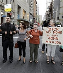 | | Sydney, Australia: Demonstrators lock arms and block a major inner city intersection during a protest against US Vice President Dick Cheney's visit Thursday. Prime Minister John Howard, is one of Washington's staunchest supporters in the increasingly unpopular Iraq war. (Mark Baker/AP) | Resolved, that Richard B. Cheney, vice president of the United States, should be impeached for high crimes and misdemeanors and that these articles of impeachment be submitted to the American people.