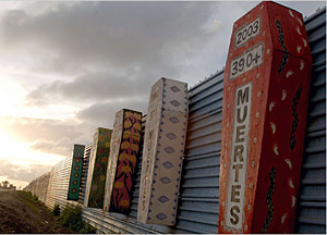 | | In Tijuana, the metal border barrier is decorated with painted coffins, each marked with the number of migrants who died trying to cross into the U.S. in a given year. (Luis J. Jimenez/NYTimes) | Tijuana, Mexico - The Mexican authorities complained recently that American construction workers putting up a barrier on the border between Mexico and the United States had trespassed into Mexico a full 10 meters.