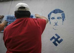 | | A protester spray-paints a wall during a demonstration against U.S. President George W. Bush upcoming visit, in Guatemala City March 3, 2007. (Reuters/Carlos Duarte) | US President George W Bush's longest Latin American trip, which begins Thursday, has a clear goal: to decrease the threatening influence of Hugo Chavez.