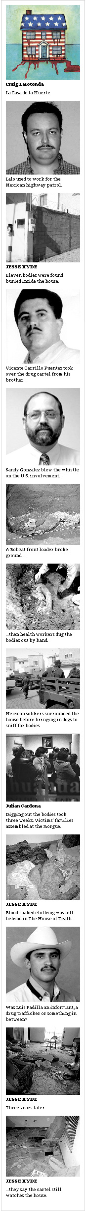 As Lalo works his way up the organization, he begins hearing about executions. There is the fat man, El Gordo, who was decapitated and thrown in a ditch, and the two municipal police officers who were executed by another cop, and the drug runner who drove a black Jeep Cherokee with plates from some Midwestern state. One of the main executioners is a man named Loya (no relation to attorney Raul Loya), the night watch commander for the Chihuahua state police. He is Santillan's nephew and the ringleader of La Línea, or the Gatekeepers. They are the cartel's henchmen.