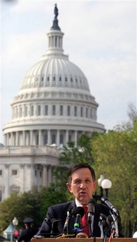 | | Democratic presidential hopeful Rep. Dennis Kucinich, D-Ohio, announces articles of impeachment against Vice President Dick Cheney this week on Capitol Hill in Washington. Kucinich holds a copy of the atricles. (AP/Lauren Victoria Burke) | Ohio Democratic Rep. Dennis J. Kucinich on Tuesday introduced articles of impeachment against Vice President Dick Cheney for "high crimes and misdemeanors" related to his participation in the buildup for the war in Iraq - and what the longshot Democratic presidential contender said was belligerent rhetoric toward Iran.