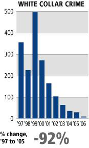 • White-collar crime investigations by the bureau have plummeted in recent years. In 2005, the FBI sent prosecutors 3,500 cases - a fraction of the more than 10,000 cases assigned to agents in 2000.