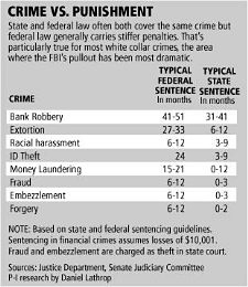And federal sentences for white-collar crimes are generally tougher than those meted out in state courts. In Washington, for example, the average federal money-launderer was sentenced to 35 months in prison in 2006, while the average state court sentence was probation.