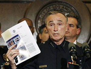 | | Los Angeles police Chief William J. Bratton holds the department's media guideline during a news conference with city leaders at Los Angeles City Hall Wednesday, May 2, 2007. Bratton said some of the police tactics to clear immigration protesters from a park were "inappropriate," as numerous news videos showed officers striking people including journalists with batons and firing rubber bullets into crowds that included children. (AP/Kevork Djansezian) |