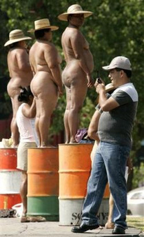 | | A man snaps a photo from his cellphone of a protest of nude farmers in downtown Mexico City, Mexico, Apri,l 2006. In recent years, the protests from the group 400 Pueblos - who fight for land rights for poor farmers - have become an anual event for city residents, as the men and women from rural southern Mexico stand naked or nearly-naked along the city's busy avenues. (AP/Gregory Bull) | Most days last week hundreds of men and women from this peasant movement stripped off to put pressure on the government to resolve long-running land disputes in the eastern state of Veracruz.