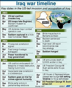 | | A graphic with the key dates in the US-led invasion and occupation of Iraq. US President George W. Bush and top Democrats publicly vowed Wednesday to find common ground on Iraq but feuded bitterly in the harshest fight over war powers since the end of the Vietnam conflict. (AFP/Graphic) | Washington - The Democratic-controlled House failed Wednesday to override President Bush's veto of an Iraqi war spending bill with timetables for troop withdrawals.