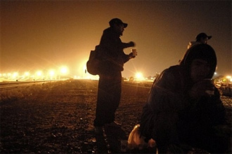 | | Deported migrants are backlit by lights coming from the US side of the US-Mexico border as they eat food given to them by the humanitarian migrant assistance group Angeles del Desierto, or Desert Angels, near the Tijuana river levee in Tijuana, Mexico, Saturday, June 9, 2007. (AP/David Maung) |