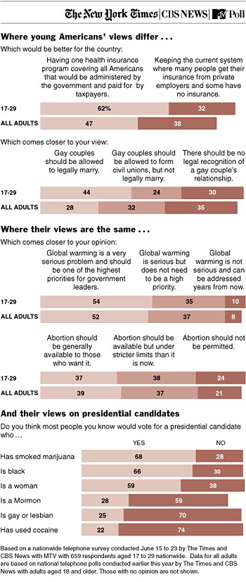 The nationwide telephone poll — a joint effort by The New York Times, CBS News and MTV — was conducted from June 15 to June 23. It involved 659 adults ages 17 to 29. The margin of sampling error is plus or minus four percentage points for all respondents.
