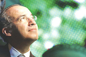 | | Mexico's President Felipe Calderon looks up during a celebration at the headquarters for the ruling National Action Party (PAN) in Mexico City, Monday, July 2, 2007. (AP/Gregory Bull) | Mexico City - Every Monday morning, President Felipe Calderon settles in at the head of the table in the presidential library at Los Pinos, Mexico's fortress-like chief executive's compound.