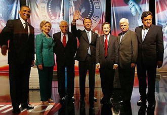 | | Barack Obama, left, Hillary Clinton, Mike Gravel, John Edwards, Dennis Kucinich, Christopher Dodd and Bill Richardson. (Joe Raedle/Getty) | Coral Gables, Fla. — The first presidential forum to be conducted in Spanish placed a couple of the Democratic participants in an uncomfortable position Sunday night: answering tough questions while simultaneously fiddling to make sure their earpieces didn't fall out and they could hear the translation of the next question.