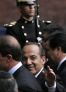 | | Mexico's President Felipe Calderon waves as he enters Congress in Mexico City, Saturday, Sept. 1, 2007, where he turned in his state-of-the-nation address. Calderon became the second president in a row who failed to give his annual speech in Congress. (AP/Marco Ugarte) | Mexico City - For days before President Felipe Calderón's appearance Saturday at a joint session of Congress here, opposing lawmakers argued over the stage directions of what used to be a routine bit of political theater.