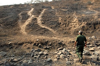 | | United States Border Patrol agent Joe Mason inspects numerous hillside paths used by people trying to cross the border, which had previously been difficult to see, were left exposed after fire burned the surrounding vegetation near Dulzura, Calif., Tuesday, October 23, 2007. The Harris fire had burned through the area the day before along the U.S.-Mexico border. (AP/David Maung) | The Harris fire along the U.S.-Mexico border is affecting various aspects of immigration in San Diego County, in particular the busy human-smuggling routes surrounding Tecate and Campo.