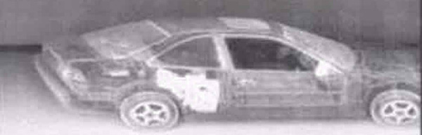 | X-Ray photograph of one of the many vehicles containing hidden compartments used to return drug money obtained in the United States to drug suppliers in Mexico. The photo shows the back right panel of the vehicle filled with cash obtained from drug sales.