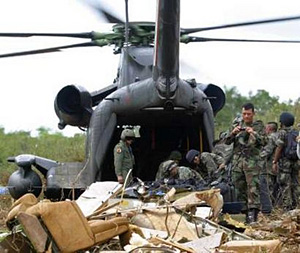 | | Soldiers load a helicopter with part of the 3.3 tonnes of cocaine found in the wreckage of a Gulfstream aircraft which crashed in the Yucatan peninsula September 24, 2007. An airliner stuffed with dozens of sacks of Colombian cocaine crashed in the jungle of southern Mexico, police said. Local police officer Eustaquio Arredondo told reporters no casualties had been found but one person who was apparently on board the aircraft had been arrested. (Reuters) | Mexico City - U.S. anti-drug aid to Mexico is to be increased from 40 million to over 500 million dollars a year, an unprecedented boost in funding that will expand a controversial strategy in which the military is heavily involved in the war on drugs.