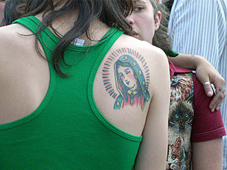 | Many young women wear tattoos of the Virgin of Guadalupe. She's a symbol of empowerment, the divine feminine, and pop culture. (Julia Steinecke)
