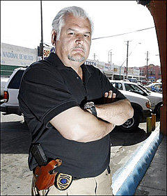 | Alfredo Arenas Moreno of the Baja California state police stands along a street in downtown Mexicali, Mexico, Wednesday, Nov. 7, 2007. Arenas recently captured fugitive Kelsey Peterson in Mexicali with the aid of a GPS-enabled cell phone. According to Arenas his unit has captured 193 U.S. fugitives in the last five years. (AP/Denis Poroy)