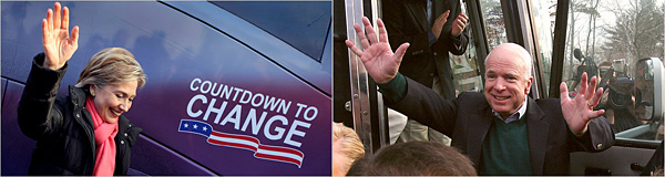 Sen. Hillary Rodham Clinton powered to victory in New Hampshire's Democratic primary Tuesday night in a startling upset, defeating Sen. Barack Obama and resurrecting her bid for the White House. Sen. John McCain defeated his Republican rivals to move back into contention for the GOP nomination.