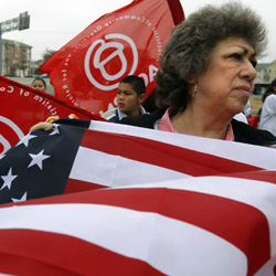 | | Irene Valdez of Las Cruces, New Mexico, attends a rally in Dallas. About 100 legal immigrants waiting for citizenship marched to the US Citizenship and Immigration Services office to protest delays in processing their application in time for them to register as voters in the upcoming presidential election. (Jessica Rinaldi/Reuters) | | | The unprecedented 1.4 million surge in U.S. citizenship applicants won't translate into an equal number of new voters come November's presidential election because of a processing backlog.