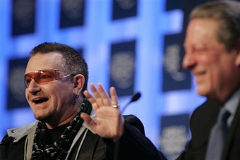 | | Irish musician Bono, left, gestures as former United States Vice-President Al Gore reacts as they address a conference at the World Economic Forum in Davos, Switzerland, Thursday Jan. 24, 2008. (AP/Michel Euler) | | | Brussels - The seemingly incongruous presence of Bono, a pop singer rarely spotted without his wraparound sunglasses amid the sombre suits of business and political leaders attending the World Economic Forum (WEF), should ensure that the question of how to end African poverty features prominently in media coverage of the January 23-27 event.