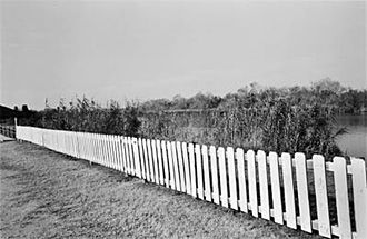 | | A white picket fence along the Rio Grande separates the United States from Mexico. (Joseph Rodriguez/New America Media) |