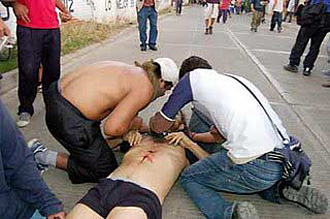| | The accused murderers of William Bradley Roland, caught on videotape as they press their assualt. Juan Carlos Soriano Velasco "El Chapulín" (at left in red t-shirt), Oaxacan police; Manuel Aguilar (middle, dark jacket), chief of staff of Santa Lucia, and Santiago Zárate (on the right in the red shirt), Director of Public Safety. |