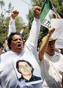 | | Marcelo Franco, left, father of Fernando Franco one of four Mexican college students who died during a Colombian Army cross-border raid on a rebel camp in Ecuadorean soil, shouts slogans in front of the Ministry of Foreign Affairs in Mexico City on March 28. (Marco Ugarte/AP) | | | Lima - On the run at home, Latin America's oldest guerrilla group has sought to expand its web outside of Colombia. But recent police seizures and arrests in neighboring nations have left the FARC insurgents isolated, unable to overcome their reputation as a terrorist group that finances its activities through extortion, kidnapping and cocaine trafficking.