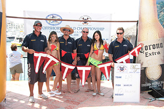 | | Setting possibly a new one day tournament record in the IGFA Offshore World Championship was the Mooloolaba, Australia team with 11 releases of striped marlin and a sailfish. Representing their win at the Springwood Marine Sailfish Shootout the team had 18 attempts at the fish in the Cabo waters. They were tied for second place at 3700 points with a team from Italy going into the final round. (Johnny Mathews) |