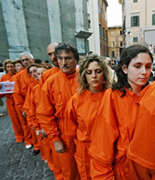 | | Members of an Italian branch of Amnesty International perform a protest dressed as Guantanamo prisoners in Rome's center. (AFP/Getty Images) | | | Washington - Anti-Americanism is at record levels thanks to US policies such as the war in Iraq, and Washington's perceived hypocrisy in abiding by its own democratic values, US lawmakers said this week.