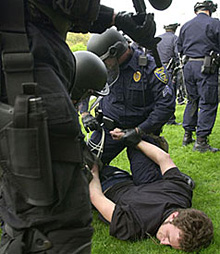 | | A demonstrator is arrested at Kent State University after several hundred anti-war protesters ignored a police order not to march on the public roadway, Sunday, May 4, 2003, in Kent, Ohio. (Haraz Ghanbari/AP) | | | "We can never forget that everything that Hitler did in Germany was 'legal,' and everything the Hungarian freedom fighters did was 'illegal.' It was 'illegal' to aid and comfort a Jew in Hitler's Germany, but I am sure that if I lived in Germany during that time I would have comforted my Jewish brothers even though it was illegal ... we who engage in nonviolent direct action are not the creators of tension. We merely bring to the surface the hidden tension that is already alive." Martin Luther King Jr.