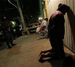 | | Men are detained on suspicion of possessing drugs during an anti-narcotics operation in the Azcapotzalco district in Mexico City February 13, 2008. (Reuters/Daniel Aguilar) | | | Mexico City - President Felipe Calderon has staked his reputation on wiping out Mexico's drug violence but his campaign is in trouble as trafficking gangs murder ever more people, target police and openly recruit hitmen.