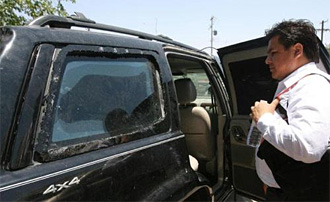 | | Angel Torres, spokesman for Mexico's Procuradura General de la Republica shows a vehicle with bulletproof glass mounted behind the windows. The violence that has plagued Juárez in recent months has many causes. (Adriane Jaeckle/El Paso Times) | | | Reputed Sinaloa drug lord Joaquin "El Chapo" Guzman Loera, accompanied by an army of sicarios (hit men), strolled into Juárez one day claiming the city's lucrative smuggling corridor as his own, so the rumor goes.