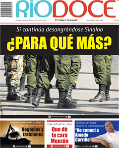 | | Ríodoce (newspaper) cover - Sinaloa keeps bleeding. Why more (soldiers)? | | | The US House of Representatives Tuesday approved a $1.6 billion, three-year anti-drug assistance plan aimed at helping Mexico and Central American countries fight the region's powerful drug trafficking organizations, but the package is now in doubt after the Mexican government voiced strong objections to provisions in the Senate version of the bill that tie the aid to human rights measures. The version of the bill in the Senate has yet to be approved.