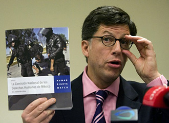 | | The Executive Director of the Americas division of the international Human Rights Watch, Jose Miguel Vivanco speaks during a press conference in Mexico City, on February 13, 2008. Vivanco said that Mexico's National Human Rights Comission (CNDH) is not completely effective in putting an end to situations of human rights violations in Mexico. (AFP/Getty) | | | Mexico City – Mexican soldiers, accused of killing seven people and torturing suspects in their battle against drug cartels, should be tried in civilian courts for their crimes, Human Rights Watch said Monday.