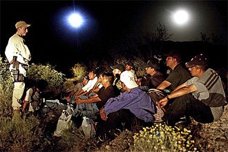 The Tohono O'odham reservation straddles the Mexican border for 75 miles in Arizona, and extends south into Mexico. According to the 2000 census, 18,000 people live on the reservation, which spans an area roughly the size of Connecticut.