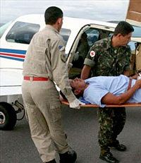 | | Soldiers carry an indigenous man who was shot by armed guards protecting rice fields at the Raposa Serra do Sol reservation in Roraima state, Brazil, in May 2008. The reservation has seen decades of conflicts between indigenous residents and settlers, most of whom are large-scale rice farmers. (Jader Souza/AP) | | | Boa Vista, Roraima, Brazil - An imminent decision by Brazil's Supreme Court on the demarcation of the Raposa Serra do Sol indigenous reservation in the Amazon jungle region has the country's native communities on edge, because of the precedent it will set.